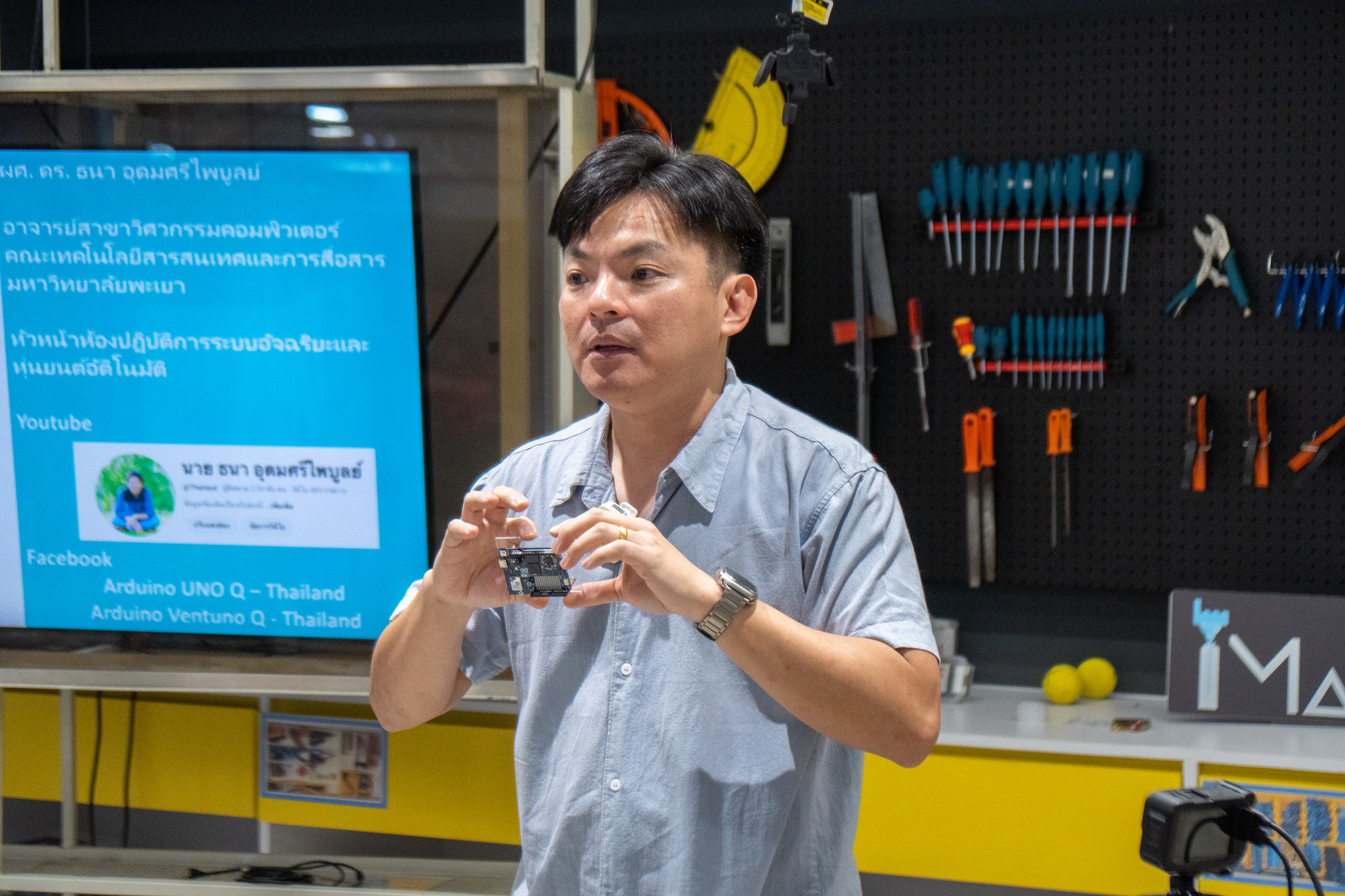 ผู้ช่วยศาสตราจารย์ ดร.ธนา อุดมศรีไพบูลย์ อาจารย์ประจำสาขาวิชาวิศวกรรมคอมพิวเตอร์ คณะเทคโนโลยีสารสนเทศและการสื่อสาร มหาวิทยาลัยพะเยา ได้รับรับเชิญจาก iMAKE Innovation Co., Ltd. ให้เป็นวิทยากรถ่ายทอดความรู้และประสบการณ์การอบรม “Arduino UNO Q for Educators and Teaching Assistants” จัดขึ้นระหว่างวันที่ 20–24 เมษายน 2569 ณ iMake ชั้น 4 โซนการศึกษา Paradise Park ศรีนครินทร์ ในรูปแบบ Onsite และ Online ซึ่งจัดอบรมโดย iMAKE Innovation Co., Ltd. (บริษัท ไอเมค อินโนเวชั่น จำกัด) ตลอดระยะเวลา 5 วัน ผู้เข้าอบรมได้เรียนรู้อย่างเข้มข้น ตั้งแต่พื้นฐานการใช้งานบอร์ด Arduino UNO Q การเชื่อมต่ออุปกรณ์อิเล็กทรอนิกส์การเขียนโปรแกรม ตลอดจนการประยุกต์ใช้ในงานด้าน AIoT (Artificial Intelligence of Things) และ Embedded System ซึ่งเป็นเทคโนโลยีสำคัญในโลกอนาคต