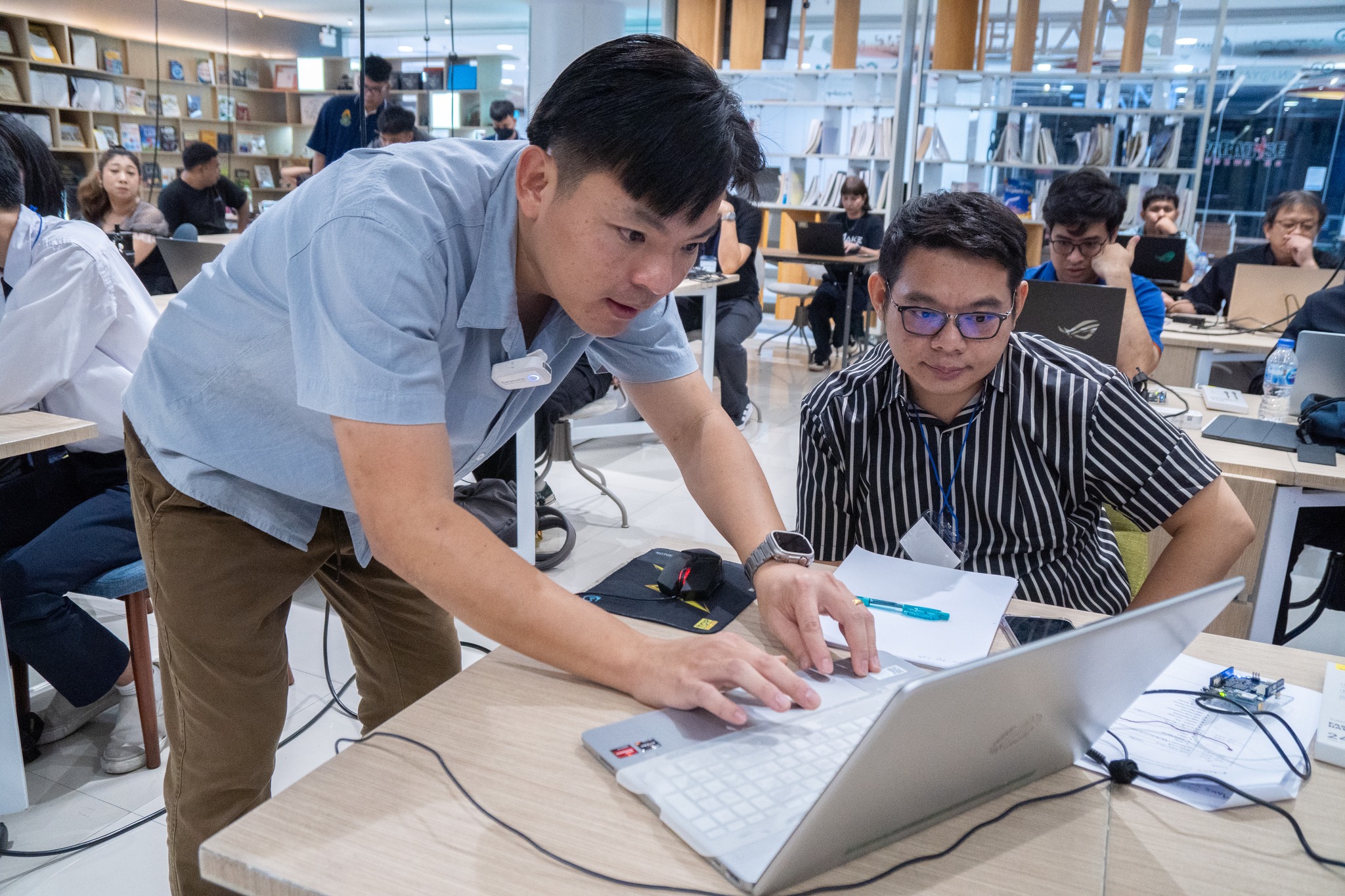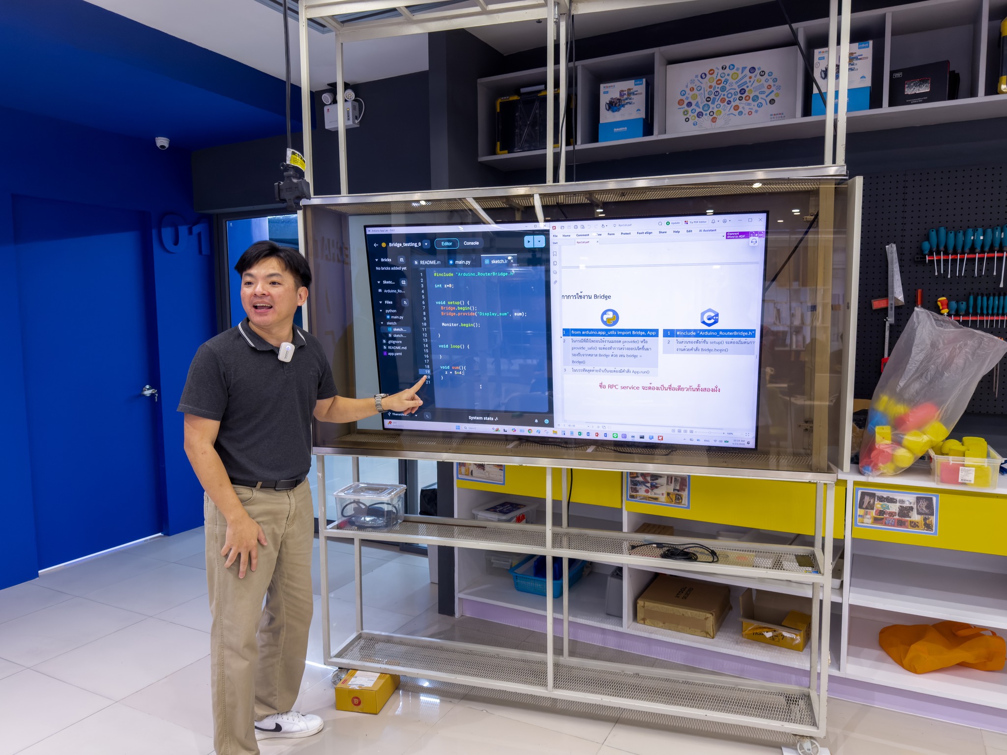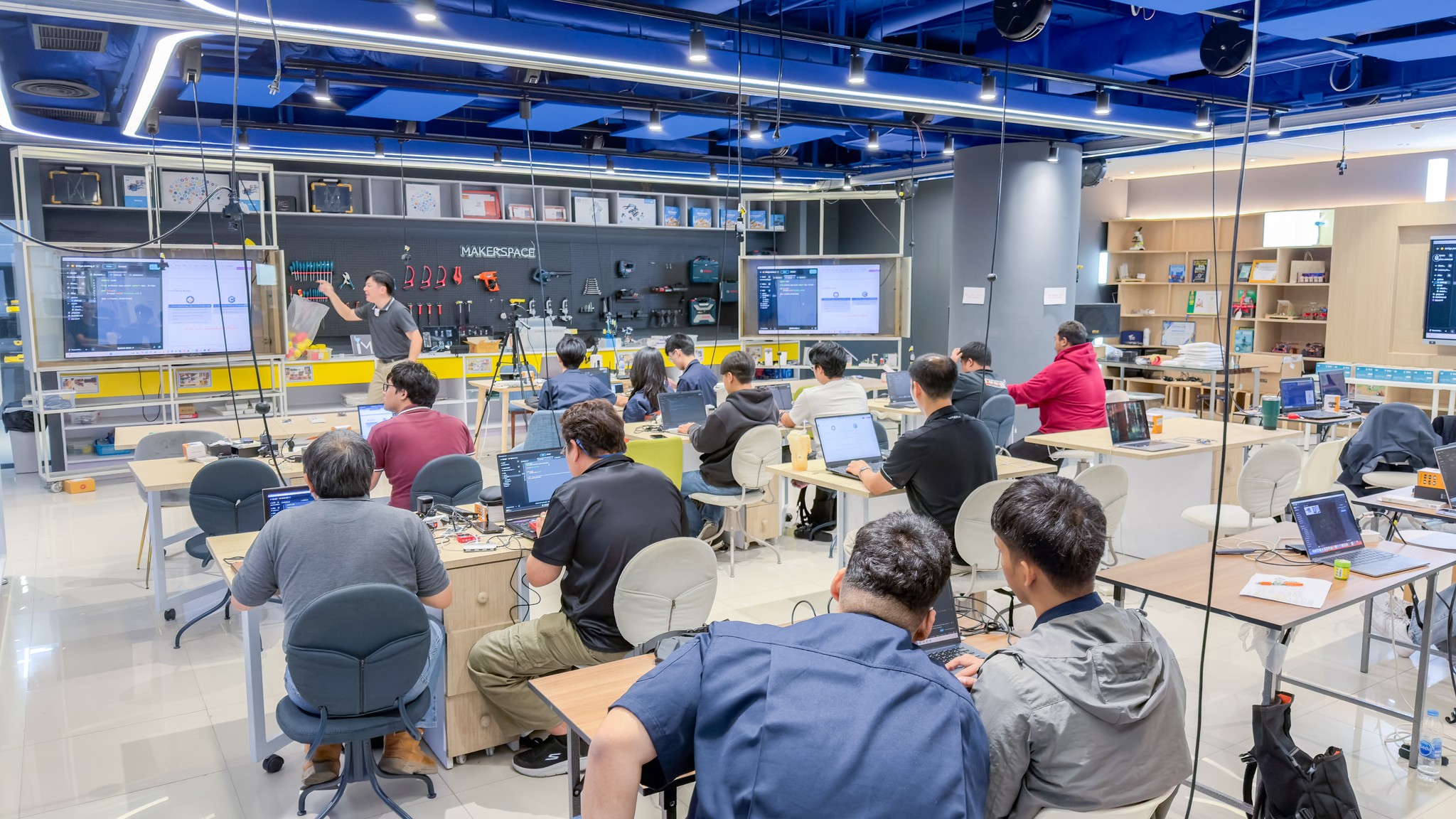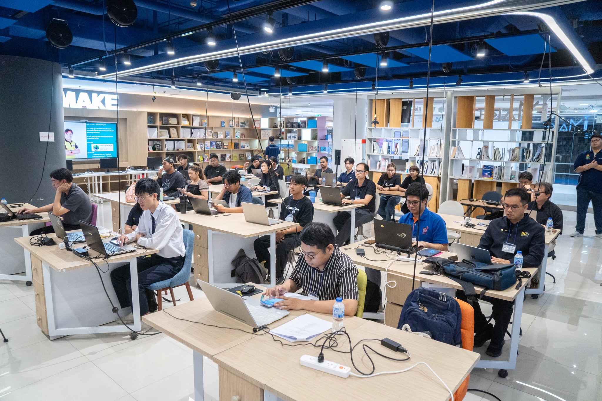 โดยได้สรุปองค์ความรู้ เชื่อมโยงเนื้อหาทุกหัวข้อ และนำเสนอแนวทางการประยุกต์ใช้เทคโนโลยีในการจัดการเรียนการสอน รวมถึงการพัฒนาโครงงานของผู้เรียนอย่างเป็นรูปธรรม บรรยากาศการอบรมเต็มไปด้วยความมุ่งมั่นและการแลกเปลี่ยนเรียนรู้ ผู้เข้าร่วมต่างให้ความสนใจ ซักถาม และแบ่งปันแนวคิดอย่างสร้างสรรค์ สะท้อนถึงความพร้อมของอาจารย์และ TA ในการนำองค์ความรู้ที่ได้รับไปต่อยอด ถ่ายทอดสู่ห้องเรียน และพัฒนาศักยภาพของผู้เรียนให้ก้าวทันเทคโนโลยีในอนาคต
