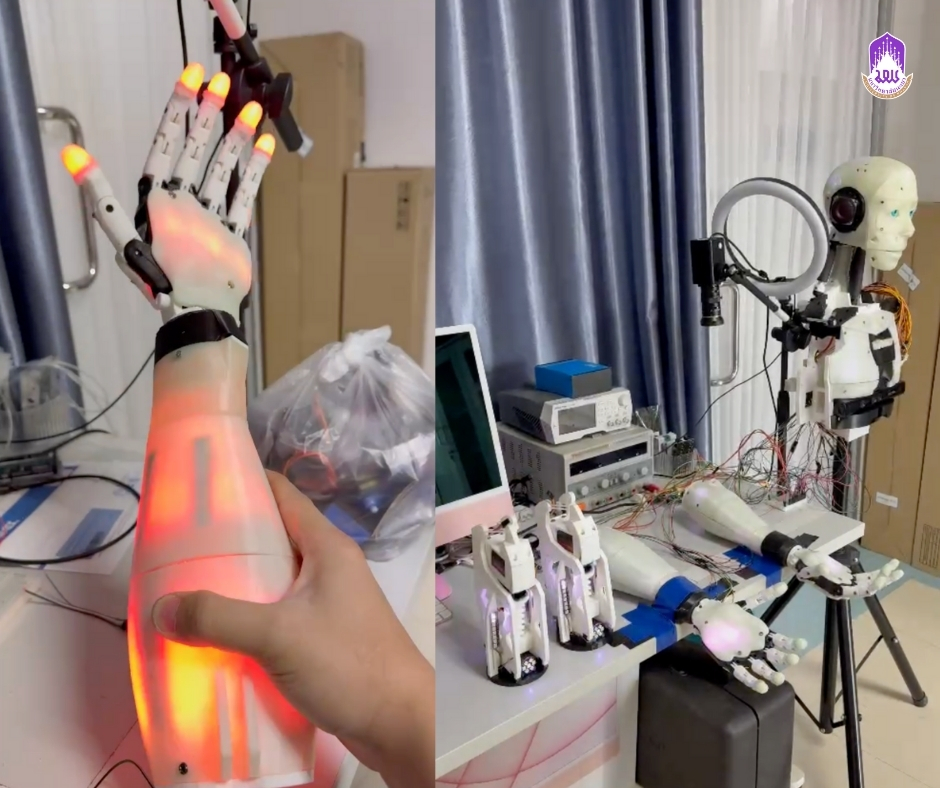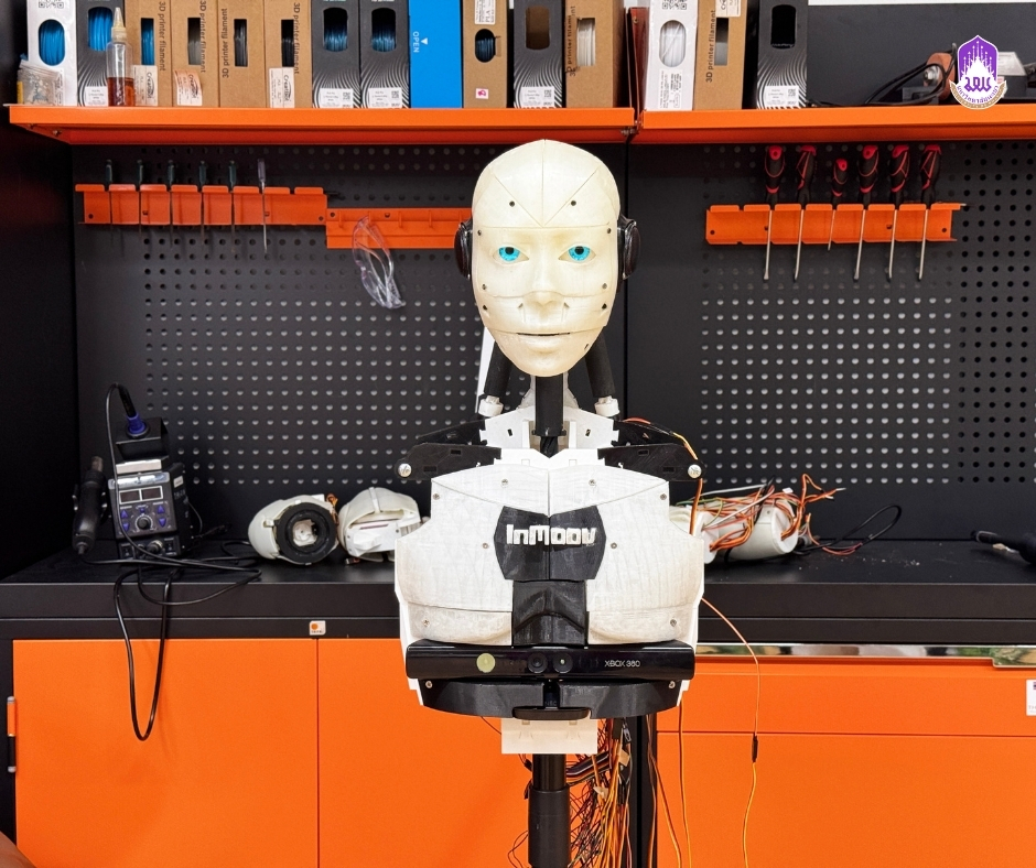 นอกจากนี้ยังได้เล่าถึงที่มาของ “โครงการพัฒนาหุ่นยนต์ต้นแบบ สำหรับการลาดตระเวนตรวจการ” ซึ่งได้รับความร่วมมือจากทีมงานพัฒนาหุ่นยนต์แบบ Open source ที่ใหญ่ที่สุดของโลกในชื่อ “inMoov” ซึ่งมีสมาชิกกระจายอยู่ทั่วโลก และมหาวิทยาลัยพะเยาเป็นเพียงสถาบันเดียว ในประเทศไทย ที่ได้รับเกียรติให้ร่วมเป็นสมาชิกภาคีเครือข่ายในการพัฒนาหุ่นยนต์ร่วมกับทีมงานระดับนานาชาติ ซึ่งหุ่นยนต์ต้นแบบดังกล่าว ถูกออกแบบให้สามารถตรวจการณ์ภายในพื้นที่อาคารได้อย่างมีประสิทธิภาพ โดยใช้วัสดุในการผลิตที่สามารถเรืองแสงได้ในเวลากลางคืน ซึ่งช่วยลดการใช้พลังงานจากแบตเตอรี่ในช่วงเวลาที่มีแสงน้อย นอกจากนี้ยังมีการผสานเทคโนโลยีอินเทอร์เน็ตในทุกสรรพสิ่งหรือ Internet of Things (IoT) และปัญญาประดิษฐ์ (AI) เพื่อช่วยเพิ่มขีดความสามารถในการทำงานของหุ่นยนต์ เช่น การเรียนรู้และจำแนกใบหน้าของบุคคล การแจ้งเตือนภัยผ่านอุปกรณ์มือถือหรือแท็บเล็ต การตรวจจับความร้อน การตรวจวัดแก๊สรั่ว การตรวจจับแรงสั่นสะเทือน รวมถึงความสามารถในการใช้เซ็นเซอร์เพื่อหลบหลีกสิ่งกีดขวาง จุดเด่นอีกประการหนึ่งของหุ่นยนต์ต้นแบบนี้คือ ความสามารถในการเข้าไปตรวจสอบในพื้นที่ที่มีความเสี่ยงสูง ซึ่งเจ้าหน้าที่รักษาความปลอดภัยไม่สามารถเข้าถึงได้และอาจะเกิดอันตรา ทำให้หุ่นยนต์สามารถช่วยลดภาระงาน และลดความเสี่ยงที่เกี่ยวข้องกับการปฏิบัติงานของมนุษย์ได้อย่างมีนัยสำคัญ