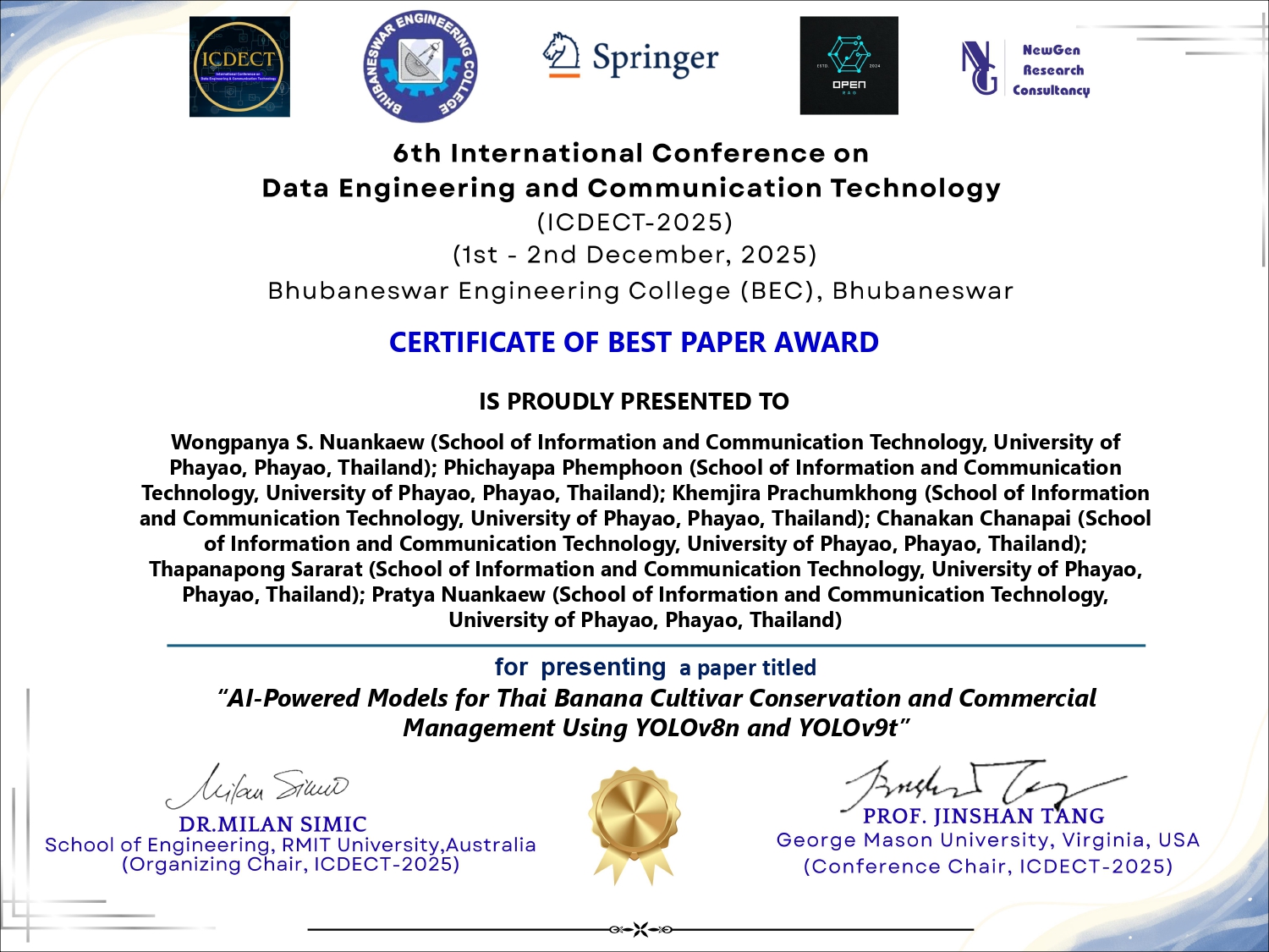 ผลงานวิจัยที่ได้รับรางวัล ได้แก่ “AI-Powered Models for Thai Banana Cultivar Conservation and Commercial Management Using YOLOv8n and YOLOv9t” ซึ่งเป็นการพัฒนาแบบจำลองปัญญาประดิษฐ์เพื่อการอนุรักษ์พันธุ์กล้วยไทยและการจัดการเชิงพาณิชย์ โดยประยุกต์ใช้เทคโนโลยีการเรียนรู้เชิงลึก (Deep Learning) ผ่านโมเดล YOLO รุ่นล่าสุด สะท้อนให้เห็นถึงศักยภาพด้านการวิจัยและนวัตกรรมทางเทคโนโลยีสารสนเทศที่สามารถนำไปใช้ประโยชน์ได้จริงในภาคการเกษตร